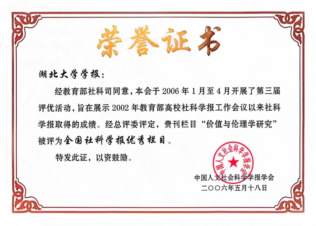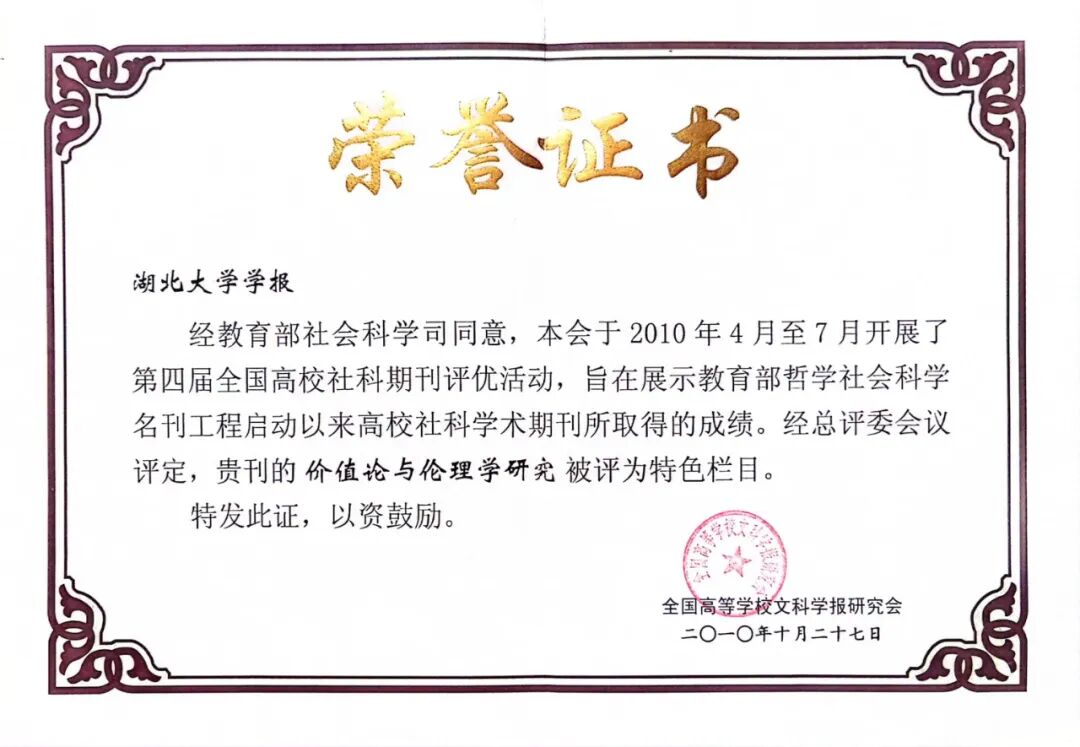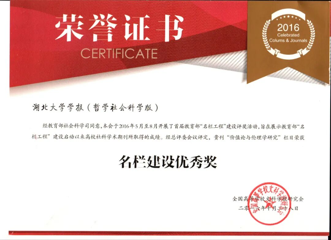 建设有特色、有品质、有影响的栏目是学术期刊高质量发展的核心竞争力。多年来,本刊依托学校优势学科,立足地方优势资源,重点培育了“价值论与伦理学研究”、“中外文艺理论研究”、“逻辑学研究”和“社会文化史研究”等栏目。通过这些特色优质栏目的建设,提高了办刊质量和学术水平,办出了自身的特色,产生了较好的学术影响和社会影响。其中,“价值论与伦理学研究”栏目创办于2000年。二十多年来,栏目根植于湖北大学伦理学学科的深厚积淀和学术优势,形成了独具特色的栏目研究主题和风格,致力于推动价值论与伦理学的交叉、融合与互动研究,搭建了从人类更好生存发展的高度进行价值论与伦理学研究的平台,提供了既从价值论又从伦理学回应和解决人类面临的各种紧迫生存问题的视角,兼具学术性与应用性、批判性与原创性、兼容性与对话性,持续推出精品力作,成为国内哲学社会科学领域公认的特色鲜明、优势突出的名栏。栏目2006年和2010年先后被评为全国高校社科学报“优秀栏目”和“特色栏目”,2012年荣获湖北期刊“特色栏目奖”,2014年入选教育部“名栏工程”建设栏目,2016年在首届教育部“名栏工程”建设评奖活动中荣获“名栏建设优秀奖”、“名栏优秀论文奖”和“名栏优秀责任编辑奖”,2023年入选首批哲学社会科学期刊重点专栏建设名单。