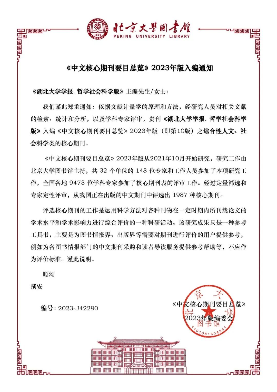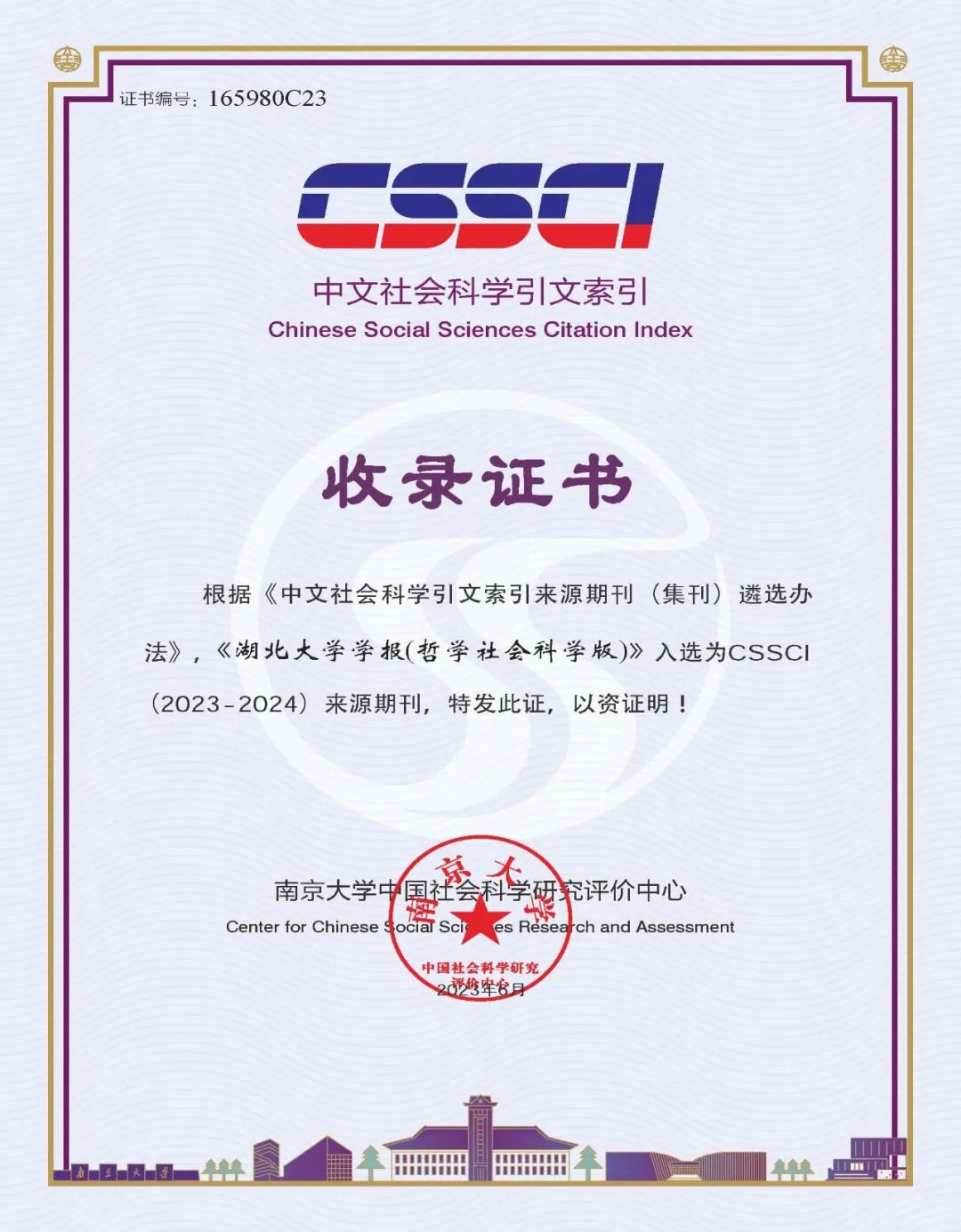经过五十年耕耘,《湖北大学学报(哲学社会科学版)》办刊质量持续提升,学术影响不断扩大,获得一系列“重量级”的荣誉:入选国家社科基金学术期刊资助名单,并两次在年度考核中获评“优秀”;被原国家新闻出版广电总局推荐为首届“百强报刊”;荣获“第四届湖北出版政府奖”、“第六届湖北十大名刊奖”、“湖北最具影响力学术期刊”称号;先后被全国高校文科学报研究会评为“全国高校精品社科期刊”、“全国高校社科名刊”、“全国高校权威社科期刊”;连续入选CSSCI来源期刊、北大中文核心期刊及中国社科院AMI核心期刊;连续入选中国人民大学书报资料中心重要转载来源期刊。重点特色栏目“价值论与伦理学研究”栏目先后获评“全国社科学报优秀栏目”、“全国社科学报特色栏目”、入选教育部“名栏工程”建设栏目、入选中宣部首批哲学社会科学期刊重点专栏。“逻辑学研究”栏目在第十届“湖北优秀期刊”评选中获评“特色栏目奖”。